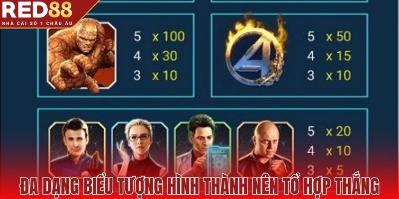 Điểm đặc biệt khiến game trở thành lựa chọn yêu thích là chủ đề gắn liền với bộ tứ siêu anh hùng: Human Torch, The Thing, Invisible Woman và Mr. Fantastic. Mỗi nhân vật không chỉ mang biểu tượng riêng mà còn đi kèm hiệu ứng chiến đấu đặc trưng, khiến mỗi vòng quay thêm kịch tính.