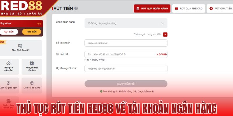 Tại giao diện rút tiền Red88, bạn chọn phương thức “Rút qua ngân hàng” và bổ sung thông tin đầy đủ theo hướng dẫn: